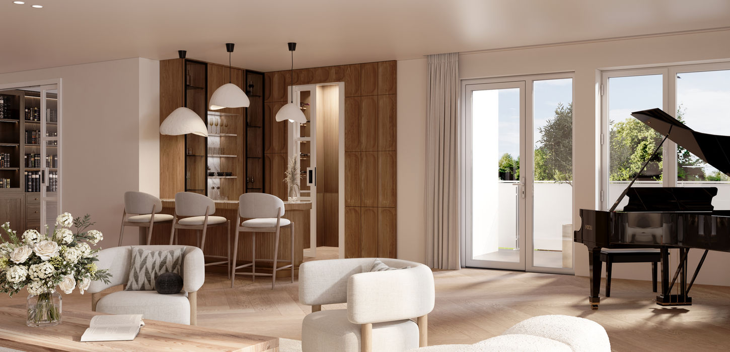 L’immeuble offre à ses occupants des hauts plafonds (265 cm), une piscine extérieure sur le toit, de vastes espaces communs avec une salle de jeux et un jardin privé.